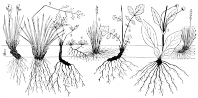 1 — осока бледная; 2 — щучка дернистая; 3 — лютик едкий; 4 — кошачья лапка; 5 — овсяница овечья; 6 - гравилат речной; 7 — сивец луговой.
