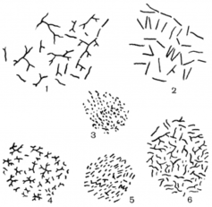 Другим характерным морфологическим признаком микобактерий является ветвление. Ветки образуются на боковой поверхности палочковидных клеток. Степень ветвления у разных микобактерий неодинакова: у одних клетки при благоприятных условиях образуют многочисленные ветки, по 2 - 5 на каждой клетке, у других обычно по 1 - 2 ветки. У многих видов ветвящиеся клетки встречаются вообще редко, а на некоторых средах вообще не обнаруживаются. Наконец, имеется много культур, у которых ветвление обнаруживается только при особых условиях культивирования. Например, у синих (Mycobacterium cyaneum) и черных (Mycobacterium nigrum) микобактерий ветвления на обычных средах (МПА, сусло-агар) не наблюдается, клетки имеют бактериальное строение; при посеве их на ломтики картофеля или в жидкие среды обнаруживается большое количество типичных ветвящихся клеток. Следовательно, ветвление у микобактерий зависит в значительной степени от питательной среды [5].