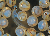 Рисунок 3 – Личинка (10 мм), и икринка (2мм) омуля, (baikalfoto.org)