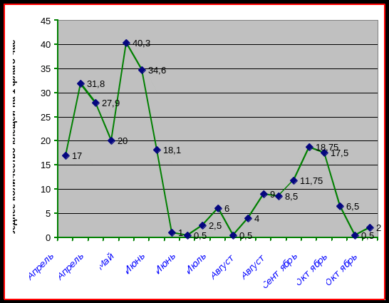По результатам наших сборов на диаграмме отмечается двухвершинная кривая с максимумами в середине мая (более высокий) и в середине сентября (более низкий). Отмечена высокая численность клещей и в апреле месяце.