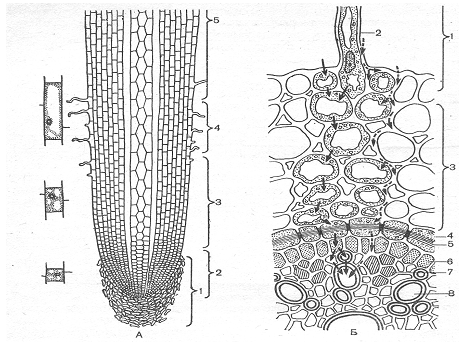 А - продольный разрез: 1-корневой чехлик; 2- меристема; 3-зона растяжения; 4- зона корневых волосков; 5- зона ветвления;