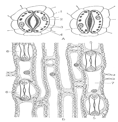 Рис.3 Структура устьиц у двудольных (А) и однодольных (Б) растений: