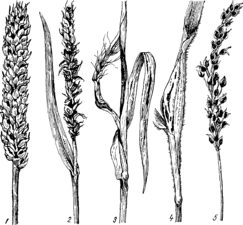 1 - твердая головня пшеницы; 2 - пыльная головня пшеницы; 3 - стеблевая головня ржи; 4 — пыльная головня проса; 5 — пыльная головня овса.