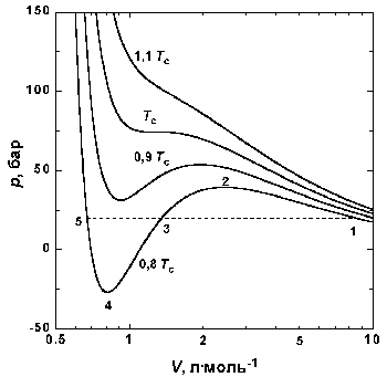 Согласно правилу Максвелла (the Maxwell construction), которое имеет теоретическое обоснование, для того, чтобы расчетная кривая соответствовала экспериментальной равновесной изотерме, нужно вместо кривой 12345 провести горизонтальную прямую 15 так, чтобы площади 1231 и 3453 были равны. Тогда ордината прямой 15 будет равна давлению насыщенного пара, а абсциссы точек 1 и 5 – мольным объемам пара и жидкости при данной температуре.