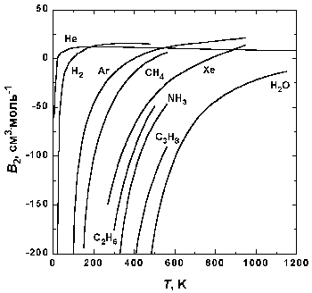 Если подходить в вириальному уравнению только как к эмпирическому уравнению состояния, то оно имеет ряд недостатков. Например, как показывают экспериментальные данные, сходимость ряда не очень хорошая, особенно в области высокой плотности. Кроме того, при высоких плотностях для удовлетворительного описания экспериментальных данных необходимо использовать большое число членов ряда, а для этого нужно экспериментально определять большое число вириальных коэффициентов. Более того, часто тот же набор экспериментальных данных можно более точно описать с помощью других эмпирических уравнений с меньшим числом параметров. Однако исключительная важность вириального уравнения состояния заключается в том, что это единственное из известных уравнений состояния, имеющее строгую теоретическую основу. Как будет показано в главе 2, каждый вириальный коэффициент можно выразить через силы межмолекулярного взаимодействия. Так, второй вириальный коэффициент отражает парные взаимодействия, третий – тройные и т.д. Таким образом, вириальное уравнение состояния позволяет объяснить свойства газа с позиции межмолекулярных взаимодействий.