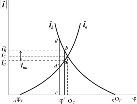. Его величине на рис.4 соответствует отрезок cd. Величина защитного тока не зависит от особенностей протекания данной анодной реакции, в частности от величины сопровождающей ее поляризации, а целиком определяется катодной поляризационной кривой. Так, например, при переходе от водородной деполяризации к кислородной сила защитного тока уменьшается и становится равной предельному диффузному току (отрезок cd / на рис.4).