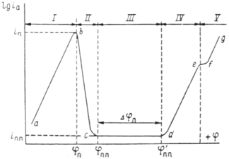 скорость окисления снова увеличивается ( участок cе ) и металл оказывается в области перепассивации или в транспассивном состоянии. Иными словами, отклонение значения потенциала от равновесного значения называется перепассивацией. При еще более высоком потенциале становится возможным процесс окисления ионов гидроксила и выделение кислорода: 4ОН-→ 2Н2О + О2 + 4е. Это соответствует участку fg. Если этот последний процесс определяет кинетику анодной реакции, то угловой коэффициент прямой fg соответствует окислению ионов ОН-.