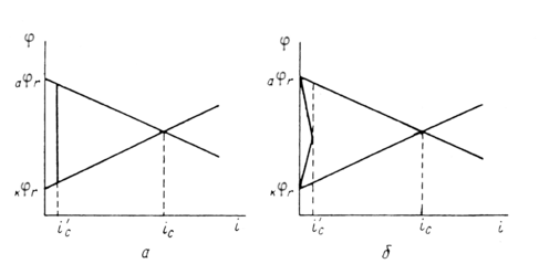 Рис. 7. Коррозионная диаграмма, показывающая, что уменьшение скорости коррозии при нанесении поверхностных защитных слоёв может быть объяснено как увеличением омического сопротивления (а), так и повышением частных коррозионных реакций (б).