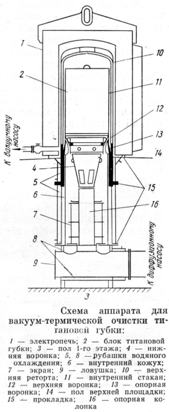 аппарат выдерживают в печи в течении 1ч при 1123°K, затем, как можно более полно, сливают хлористый магний. В печи аппарат охлаждают до 873–923°K, после чего его извлекают и устанавливают в холодильник, где его поверхность орошают вводом или обдувают воздухом для охлаждения до температуры 20-40°C.
