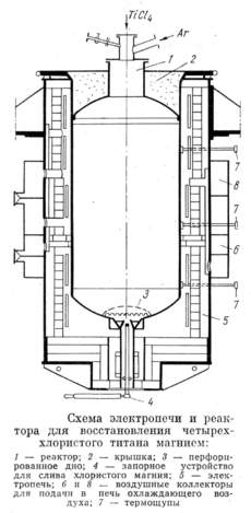 Реактор с загруженным в него магнием перед установкой в печь вакуумируют и проверяют на герметичность. Затем реактор заполняется осушенным инертным газом (обычно аргоном) и устанавливают в печь восстановления, где реактор разогревается до температуры полного расплавления и некоторого перегрева магния (650–760°C).