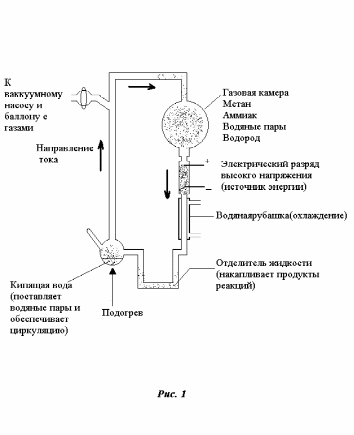 В 1953 г. Стэнли Миллер в ряде экспериментов моделировал условия, предположительно существовавшие на первобытной Земле. В созданной им установке (рис. 1) ему удалось синтезировать многие вещества, имеющие важное биологическое значение, в том числе ряд аминокислот, аденин и простые сахара, такие как рибоза. После этого Орджел в Институте Солка в сходном эксперименте синтезировал нуклеотидные цепи длиной в шесть мономерных единиц (простые нуклеиновые кислоты).