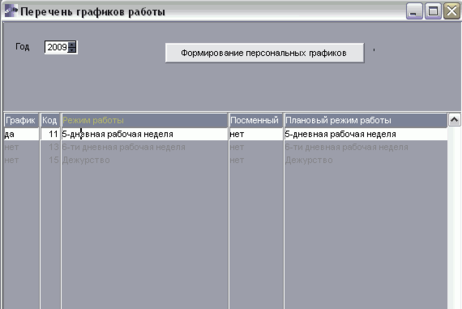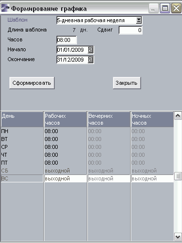 переходим к функции Графики работы. В окне = Перечень графиков работы = [ Приложение 12], исправляем год в поле Год верхней панели на 2009, в средней панели выбираем режим 5-дневная рабочая неделя, нажимаем клавишу Enter, на предложение сформировать график отвечаем Да, получаем окно = Формирование графика = [Приложение 13] . Выбираем шаблон 5-дневная рабочая неделя, проверяем наличие года и по кнопке Сформировать формируем график. С помощью кнопки Праздничные дни добавляем праздник 07/01/2009.