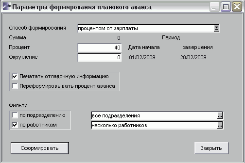 Переходим к расчету заработной платы. Выполним пункт Расчет в Межпериод \Аванс \Расчет, получим окно = Аванс =. Через правую кнопку мыши даем команду формирования аванса . В окне = Параметры формирования планового аванса = [Приложение 17], задаем соответствующие данные: