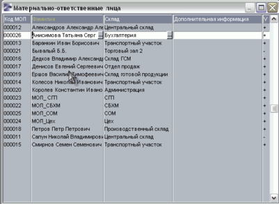 В этом каталоге содержится информация о материально-ответственных лицах предприятия (МОЛ). Оприходование и списание МЦ по складам осуществляется только через МОЛ.