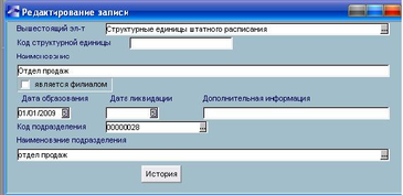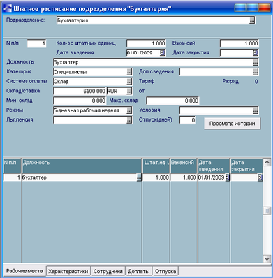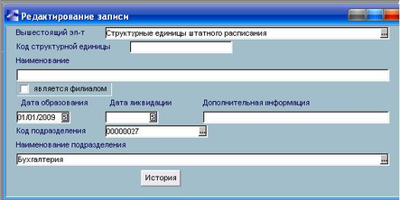 Через пункт меню База данных / Штатного расписания вносим единицу Бухгалтерия (поле наименование) с датой образования 01/01/2009 и привязываем к ней подразделение бухгалтерия (поле наименование подразделения) [Приложение 3 и Приложение 4].