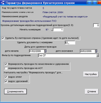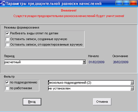 Выполняем пункт Расчет зарплаты \Расчет зарплаты \Предварительная разноска. В окне = Параметры предварительной разноски = задаем фильтр по 2-м подразделениям: бухгалтерия и отдел продаж [Приложение 19].