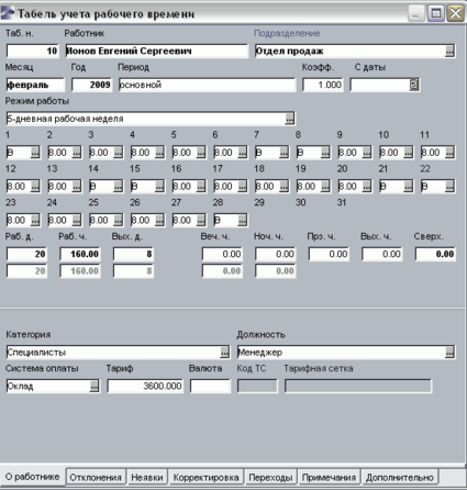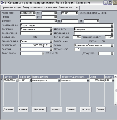 При наличие табельного номера на работника открывается лицевой счёт для начисления заработной платы. О каждом сотруднике в БД храниться подробная информация, которая вводиться и отображается в последовательности окон, выводимым нажатием кнопки ( Ctrl – enter следующие). Нажимаем 5 раз ( Ctrl – enter следующие) или клавиши alt + 6, получаем шестое окно = сведения о работе на предприятии =[Приложение 9 и Приложение 10].