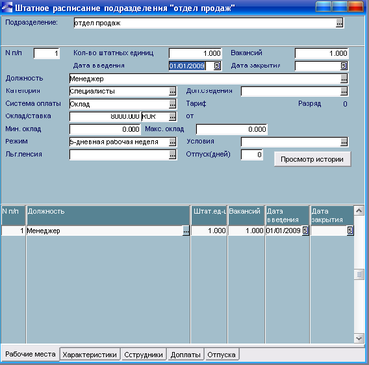 Составим штатное расписание 2-х подразделений предприятия: бухгалтерия и отдел продаж и заведём карточки 2-х сотрудников.