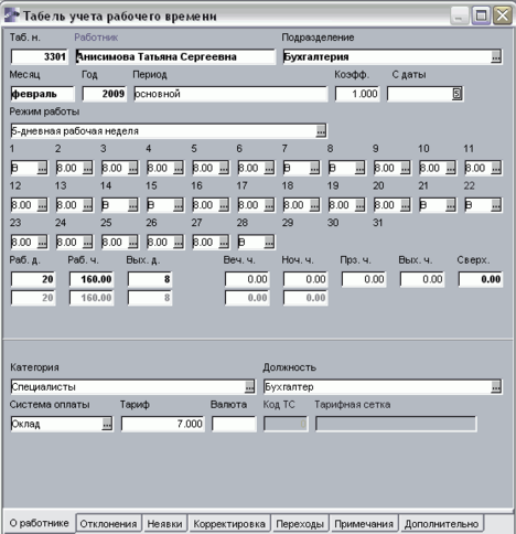 Задаем 2009 в поле год, 02 в поле месяц, установим флажок фильтр по работникам. Войдем в поле по работникам и через кнопку с троеточием получим окно = Выбор работников =. Выполним команду [Отменить всех] и затем с помощью команды [Пометить] выделим Ионова и Анисимову. Закроем окно = выбор работников =. В окне =Содержание корзины = проверяем справедливость данных и нажимаем кнопку Ввод. Для работников сформируются табели. Осуществляем проверку через пункт меню Расчет зарплаты \Табель учета рабочего времени \Просмотр табеля [Приложение 15 и Приложение 16].