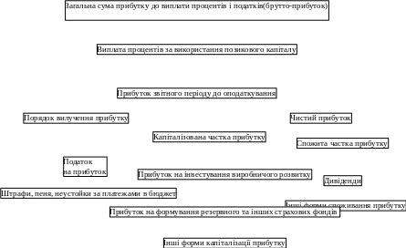 Із нього видно, що одна частина прибутку у вигляді податків і зборів надходить до бюджету держави й використовується на потреби суспільства, а інша частина залишається в розпорядженні підприємства і використовується на виплату дивідендів акціонерам підприємства, на розширення виробництва, створення резервних фондів і т. ін.