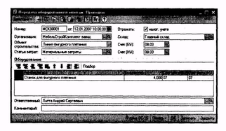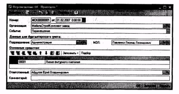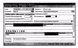 Для принятия оборудования или объекта строительства к учету в качестве основного средства используется документ "Принятие к учету ОС" (меню "ОС" — "Принятие к учету ОС"). Под операцией принятия к учету основного средства подразумевается операция формирования стоимости основного средства и постановка его на учет. Одним документом может быть оформлено принятие к учету нескольких однотипных объектов основных средств.
