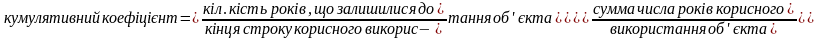 Відповідно до кумулятивного методу річна сума амортизації визначається як добуток вартості, що амортизується й кумулятивного коефіцієнта. Кумулятивний коефіцієнт розраховується розподілом кількості років, які залишаються до кінця очікуваного строку використання об'єкта основних засобів, на суму числа років його корисного використання;