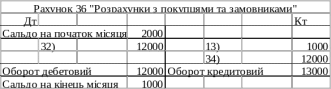 | 36 | Розрахунки з покупцями і замовниками | 2,0 | 12,0 | 13,0 | 1,0 | ||