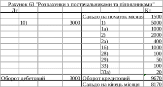 По даних Журналу реєстрації господарських операцій за звітний період складаємо бухгалтерські рахунки у вигляді Т-моделі, записуємо в них залишки на початок звітного періоду з Таблиці 3. Для активних рахунків сальдо початкове проставляємо у лівій частині (рахунки 10, 12, 20, 22, 23, 26, 30, 31, 36, 372), для пасивних – у правій (рахунки 40, 43, 44, 50, 60, 63, 64, 65, 66).