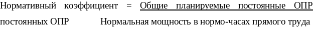 Нормативный коэффициент постоянных общепроизводственных расходов находят делением общей суммы планируемых постоянных общепроизводственных расходов на нормальную производственную мощность, выраженную в нормо-часах прямого труда (или в других единицах, выбранных для конкретного вида деятельности):