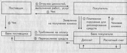 В случае расчетов чеками поставщик полностью обезопасит себя от сомнений по срокам расчета с покупателем и ускорит оплату. Для понятия сущности данной формы расчетов далее приведена схема расчетов чеками.[19]