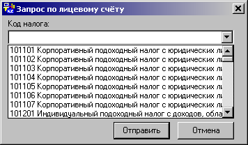 В появившемся окне заполнить требуемые параметры запроса, выбирая значения из раскрывающихся списков (Рисунок12). Правильность вводимой информации – критична. При указании неверных данных вместо ответа на запрос придёт уведомление – «Лицевой счёт отсутствует». Наличие данного кода налога в соответствии с остальными указываемыми в запросе условиями, можно проверить по выписке лицевого счёта (отражает движения/сальдо по всем открытым лицевым счетам). При указании на форме запроса, параметров запрашиваемого лицевого счёта идентичных присутствующим в выписке параметрам для данного счёта (кода налога, код налогового комитета, соответствующий счёту режим налогообложения) – запрос обработается корректно.