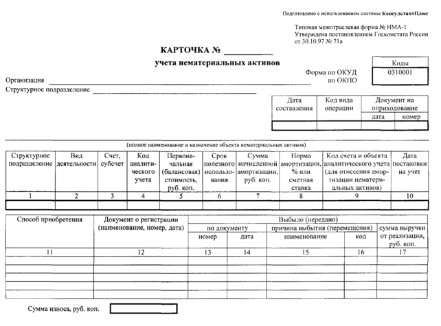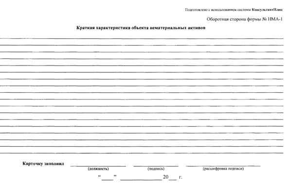 7. Аналитический учет по счету 04 «Нематериальные активы» должен вестись по каждому объекту в карточке учета нематериальных активов (форма № НМА - 1). Такой учет должен обеспечить возможность получения и обработки данных о наличии и движении нематериальных активов, необходимых для управления предприятием и составления бухгалтерской отчетности.