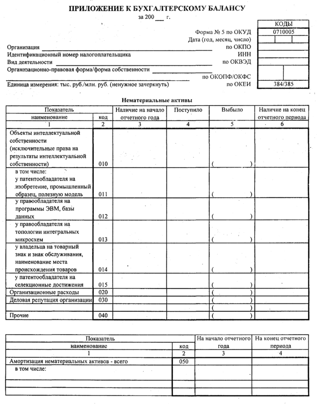 Расшифровка состава нематериальных активов приводится в Приложении к бухгалтерскому балансу (форма № 5) .