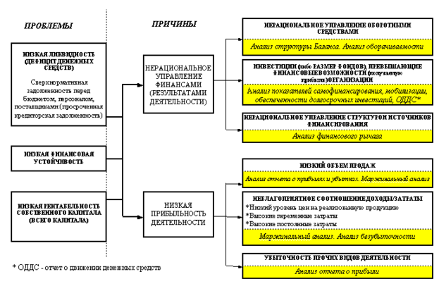 Однако определить, в какой из перечисленных областей лежит причина снижения финансовых показателей - не означает провести полноценный финансовый анализ. Необходимо дальнейшие уточнение причин - до уровня конкретных действий предприятия или внешней среды. Также необходимы управленческие рекомендации по улучшению состояния предприятия.