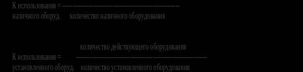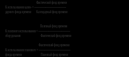 Анализ экстенсивного использования оборудования (по времени) предполагает расчет фондов времени его работы: календарного, режимного, располагаемого, планового, фактического, полезного, а также соответствующих коэффициентов, например: