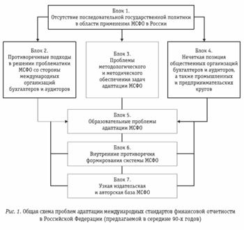 В середине девяностых годов была предпринята одна из первых попыток систематизации проблем адаптации международных стандартов финансовой отчетности в Российской Федерации. Еще тогда отмечалось, что проблематика привязки МСФО к нашим условиям связана с решением целого ряда задач, которые требуют хотя бы предварительной систематизации. И тогда же была предпринята попытка формирования общей блок-схемы проблем адаптации МСФО в России. Было выделено семь групп (блоков) проблем (рис. 1).