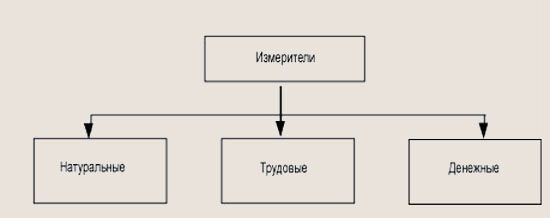 Учет ведется ежедневно не только в масштабах государства, но и на каждом предприятии, в каждом его подразделении, даже в каждой семье. И если учет - это, прежде всего, регистрация фактов и событий, то оценка этих фактов подразумевает их количественное и качественное измерение. Для этого в учете используют несколько видов измерителей: натуральные, трудовые и денежные (рис. 1.1).