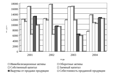 Рисунок 2 – Состояние статей актива и пассива баланса, а также выручки и себестоимости проданной продукции СПК «Чкаловский» за 2001 – 2004 гг.