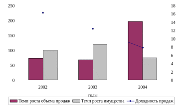 Анализируя рисунок 1, можно сделать вывод, что в 2002 и в 2003 годах темп роста объема продаж значительно ниже, чем темп роста имущества. Это говорит о том, что, начиная с 2002 года, предприятие получает все меньше продукции. Все это происходит из-за сильной изношенности машинно-тракторного парка, дороговизны ГСМ и ядохимикатов, неблагоприятных климатических условия и т. п.
