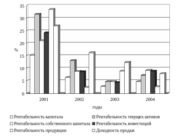 На наглядном примере можно выявить тенденцию повсеместного снижения всех показателей, и отметить 2003 год как наименее результативный. В этом году самый низкий уровень рентабельности капитала – 2,77 %, текущих активов – 4,72 %, собственного капитала – 4,7 % и рентабельности инвестиций – 4,36 %. По сравнению с 2003, в 2004 году появляется положительная тенденция экономического роста. Оценивая рентабельность инвестиций за весь период, можно сказать, что лишь в 2001 году привлечение заемных источников финансирования было экономически выгодным. А падение доходности продаж непосредственно связано с высокой себестоимостью реализованной продукции.