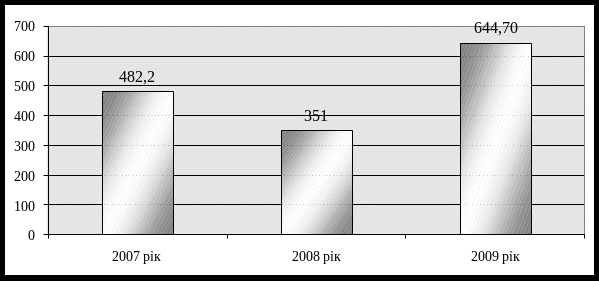 Про ефективність виробничої діяльності ТОВ «Агрофірма «Колос» можна судити з показників роботи підприємства – виручки від реалізації продукції, яка має наступну динаміку: 2007 рік – 482,2 тис.грн., 2008 рік – 351,0 тис.грн., 2009 рік – 644,7 тис.грн. (рис. 1.3).