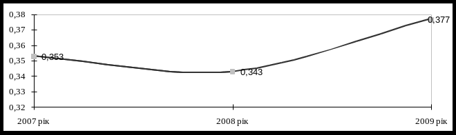 Виходячи із цих розрахунків, можна побачити, що в 2007, 2008 і 2009 роках коефіцієнт спеціалізації був середнім, однак його зменшення у 2008 році зумовлено падінням виручки від реалізації соняшника, але звернемо увагу на те, що питома вага виручки від його реалізації має тенденцію збільшення у загальному об’ємі і це в свою чергу призводить до росту коефіцієнта спеціалізації, який має наступну тенденцію (рис. 1.3):