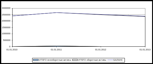 На конец анализируемого периода общая балансовая стоимость имущества компании составляет 2 653 100 руб. За анализируемый период величина суммарных активов баланса увеличилась на 253 100 руб. (10,5%). Это может свидетельствовать о расширении масштабов деятельности компании (см. график 1).