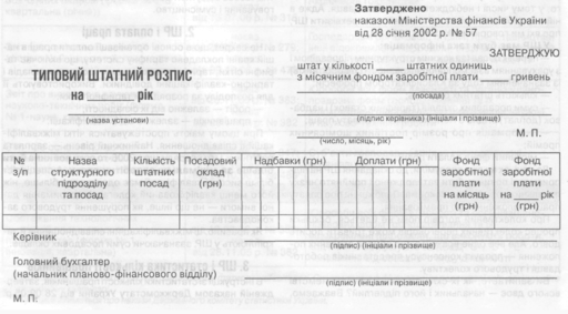 Уніфікованої форми ШР не існує. Однак у бюджетній сфері, де всі витрати (зокрема, й на оплату праці) регламентовано, така форма є. Й для бюджетників ШР обов'язковий. Затверджено її наказом Мінфіну від 28.01.02 р. № 57. І, що примітне, незважаючи на свою бюджетну спрямованість, вона (з незначними коригуваннями) підійде для потреб будь-якого, у тому числі і небюджетного, роботодавця. Адже в ній передбачено майже всі ті обов'язкові реквізити ШР, про які ми говорили в № 53 за 2005 рік.
