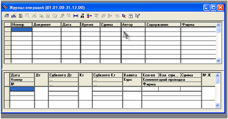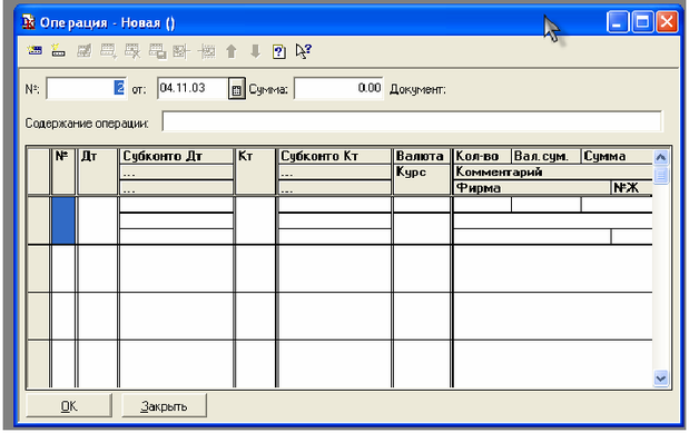 Попытка ввода в журнал операций новой строки приведет к тому, что на экране развернется новое окно, которое содержит поля для ввода реквизитов операции и составляющих ее проводок.