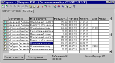 Кроме этих граф, при настройке конфигурации задачи может быть определено практически неограниченное количество дополнительных реквизитов журнала расчетов. Дополнительные реквизиты используются для хранения любых других результатов расчета, если предопределенного реквизита «Результат» не хватает с точки зрения конкретной предметной задачи. Это могут быть, например, количество дней и часов, оплаченных но тому или иному виду расчета, для случая расчета заработной платы.