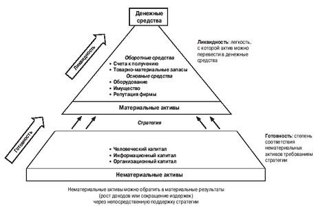 Нематериальные активы не могут и не должны измеряться таким показателем, как сумма затраченных на их развитие денег, равно как и независимыми параметрами, описывающими их ценность (человеческие ресурсы или информационные технологии). Ценность нематериальных активов определяется их соответствием стратегическим приоритетам предприятия, но не объемами денежных средств, затраченных на их создание, или тем, сколько они стоят сами по себе. Если нематериальные активы полностью отвечают стратегии, то их ценность для организации существенно возрастает. И наоборот, если нематериальные активы не соответствуют стратегии компании, то даже пусть на их развитие была затрачена большая сумма денежных средств, ценность их несравнимо мала.