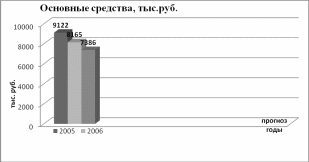 Выполненный анализ свидетельствует о том, что объем основных средств за последние 3 года имеет устойчивую тенденцию снижения, о чем наглядно свидетельствует график. На 2005 год стоимость ОПФ составила 9122 тыс.руб., а на 2007 год- 7386 тыс.руб.