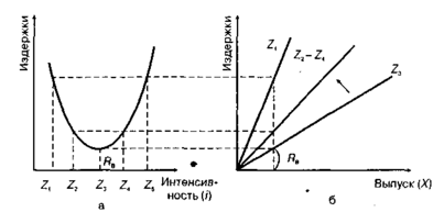 Основой адаптации к повышению интенсификации является функция средних издержек, которая показывает, какое влияние оказывает объем выпуска продукции в течение анализируемого периода на издержки потребления ресурсов на единицу выпуска. Если предприятие использует свои станки и машины с оптимальной для данных условий интенсивностью, возникают издержки потребления сырья и материалов в размере Rв (рис.6), соответствующие величине объема выпуска. Если предприятие увеличивает или снижает эту интенсивность, изменяются издержки на изделие и валовые расходы.
