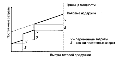 Из приведенного графика видно, что при повышении загрузки производственных мощностей и увеличении объема выпуска продукции возникают дополнительные постоянные расходы, а их общая величина становится оправданной, если себестоимость единицы продукции снижается.